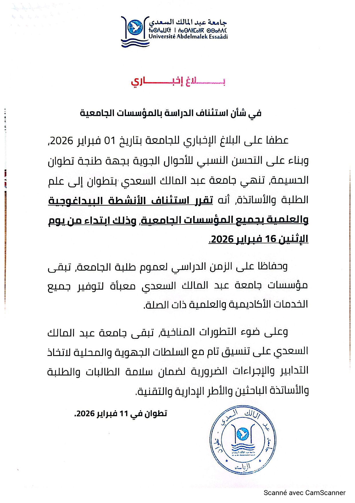 بلاغ اخباري بشان استئناف الدراسة